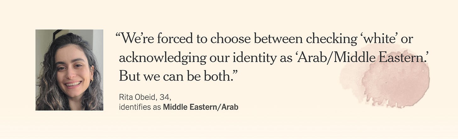 And while there’s no agreed-upon set of countries or ethnicities that would fall under a MENA category, shouldn’t we take some kind of strides towards being seen? How can MENA/SWANA folks be hyper-invisible and also discriminated against?